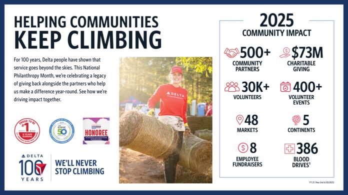 In honor of its Centennial year, Delta’s philanthropy efforts nearly tripled for Global Volunteer Month during the month of April—more than 150 community events and over 8,600 hours of service were completed around the world. Overall, in 2025, Delta Air Lines and The Delta Air Lines Foundation contributed $73 million in charitable funds, activated over 400 volunteer events with the help of over 30,000 volunteers, and supported over 500 community partners on five continents.