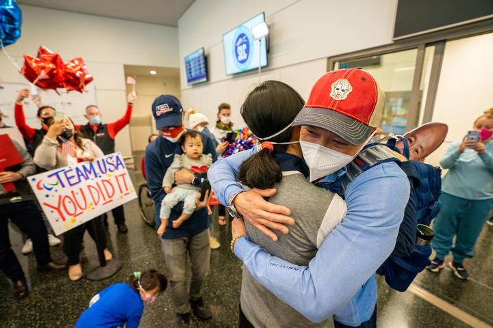Team USA sled hockey goaltender Jen Lee embraces his family upon his arrival at Salt Lake City International Airport in Salt Lake City on Tuesday, March 15.