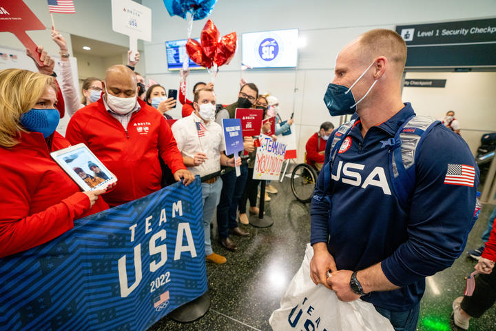 Para Nordic skier and U.S. Navy SEAL veteran Dan Cnossen is greeted by local members of Delta’s Veterans and ABLE Disability business resource groups as he arrives at Salt Lake City International Airport in Salt Lake City, Utah on Tuesday, March 15.