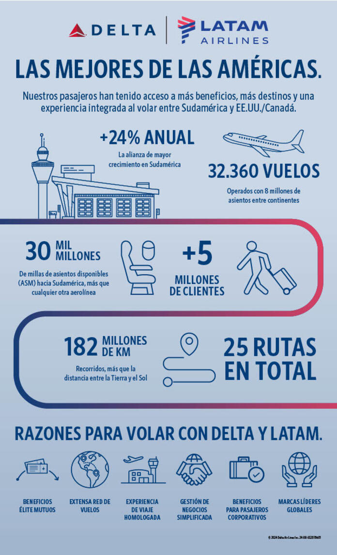 Delta y LATAM esperan seguir anunciando en los próximos meses nuevas rutas y mayores beneficios para mejorar aún más la experiencia de viaje de quienes viajan entre América del Norte y América del Sur.