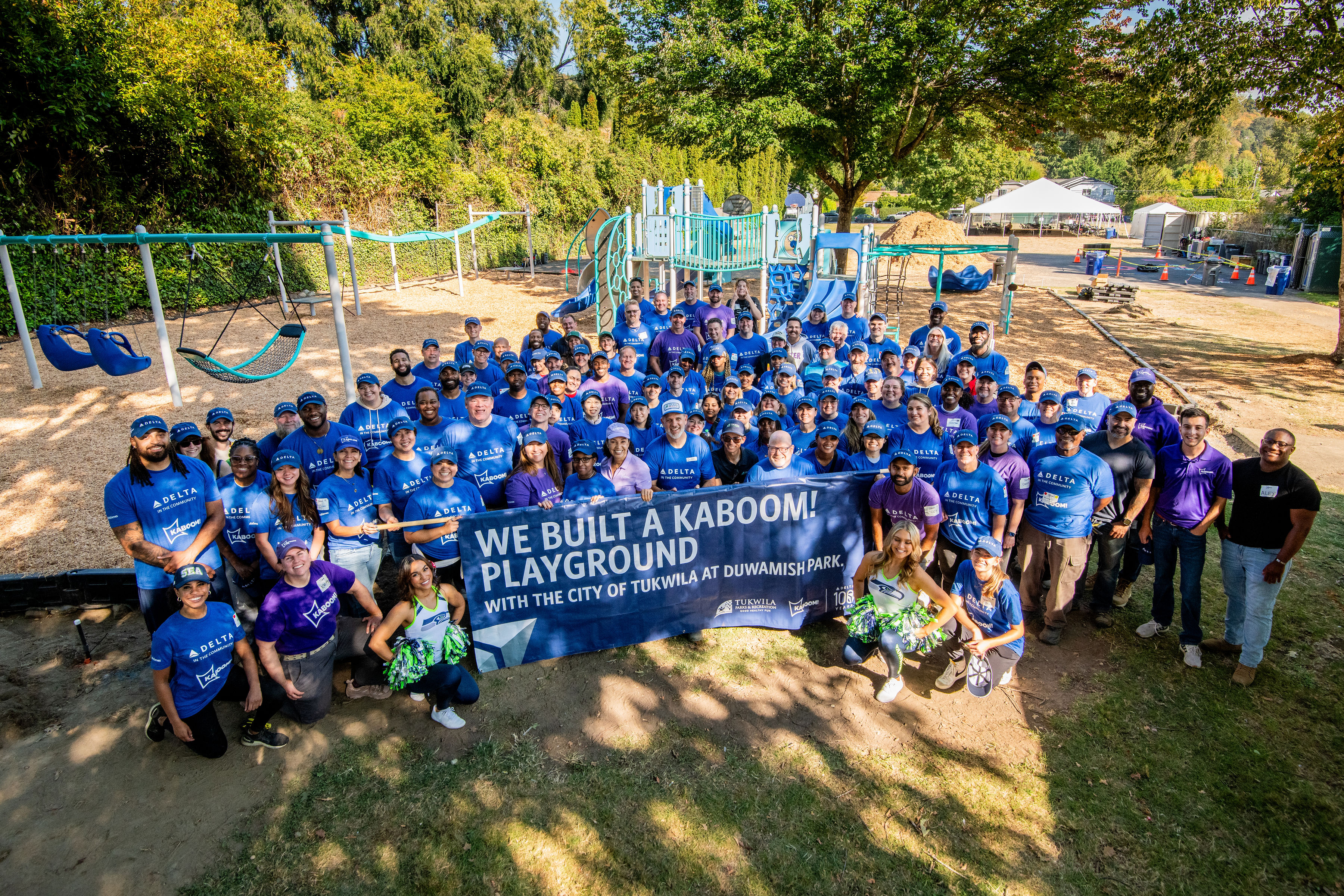 On Saturday, Sept. 27, more than 100 Delta employee and local community volunteers, including the Seattle Seahawks, came together to build Delta’s 45th KABOOM! playground and sixth in the Seattle area. Delta partnered with the City of Tukwila’s Parks and Recreation Department to build a new playspace in Duwamish Park, a diverse and vibrant community in Washington. The new playspace will serve over 800 community children.