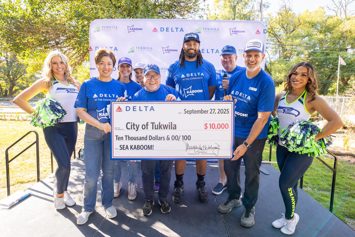 The dynamic new playground includes play structures with slides, swings, a zip line, a climbing wall and plenty of space for kids to explore. Following the build, a ribbon cutting was held with Delta representatives surprising the City of Tukwila Parks and Recreation Department with a $10,000 check from the airline.