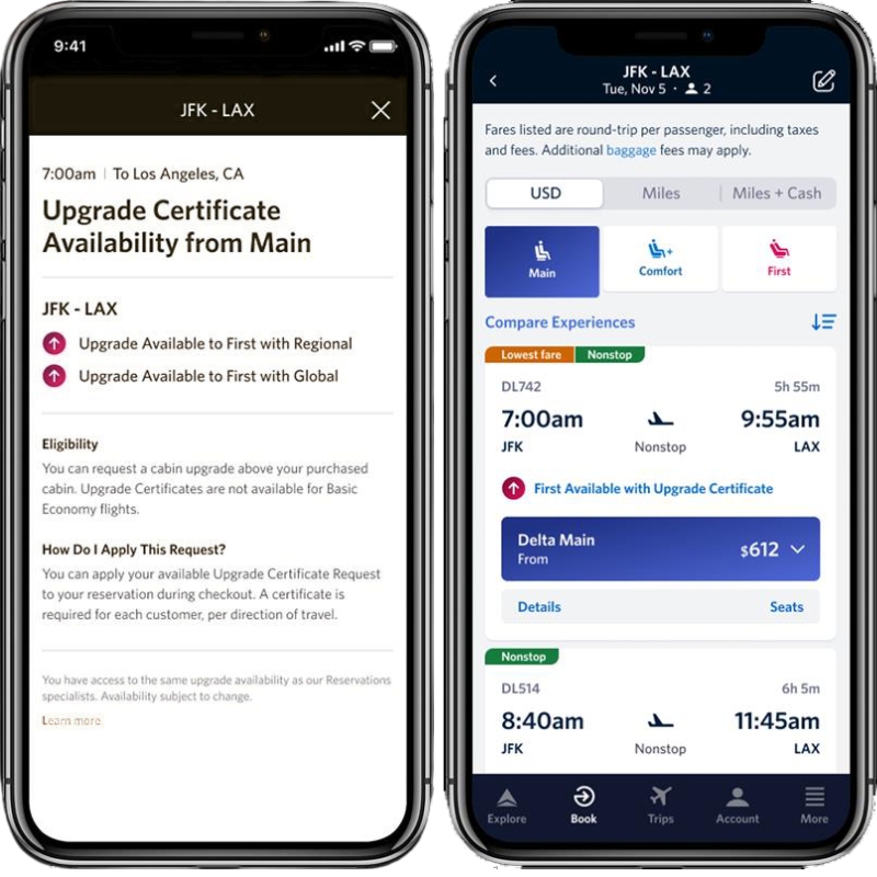 With the latest app update, Platinum and Diamond Medallion Members with eligible upgrade certificates can now see when an upgrade is available and redeem during checkout directly from the app—the same functionality that is currently available on Delta.com.