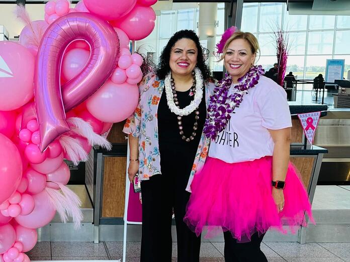 Mel, left, and Anela, right, at the Breast Cancer One charter flight.