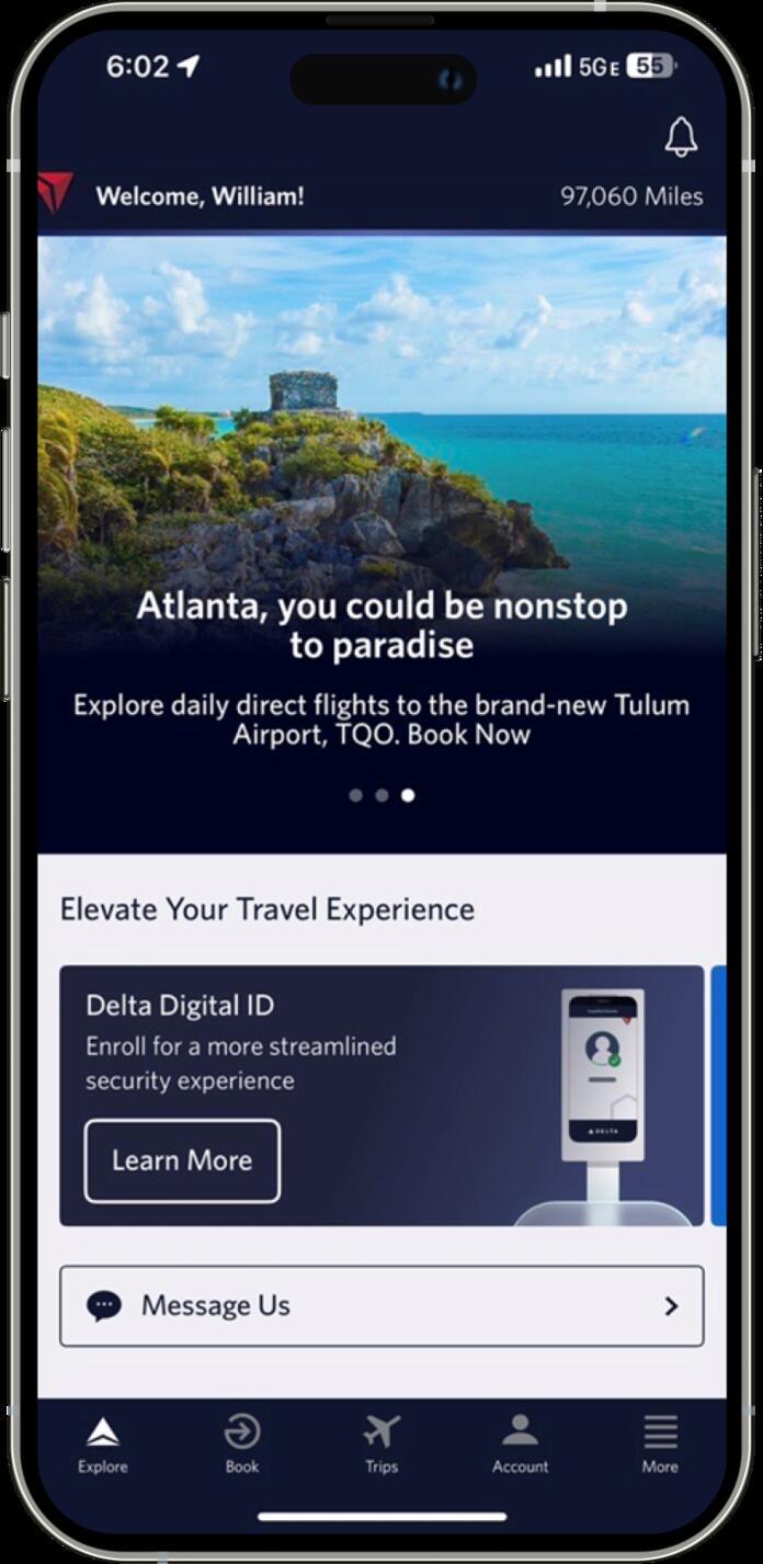 Utilice la nueva página Explore en la aplicación para inspirarse, planificar y reservar su próximo viaje en Delta con facilidad. La experiencia altamente personalizada está conectada con el ecosistema digital integrado de Delta, recordando sus experiencias recientes y destacando lugares para explorar.