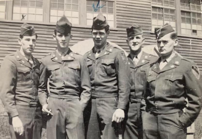 Reporting for duty, Johnnie (center) stands with fellow soldiers.