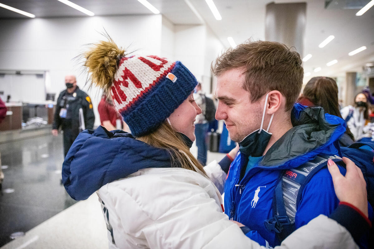 Ryan Pivirotto (right) and his fiancee, Nikki Leonard embrace as Team USA athletes arrive at Salt Lake City International Airport in Salt Lake City, Utah on Monday, February 21, 2022. (