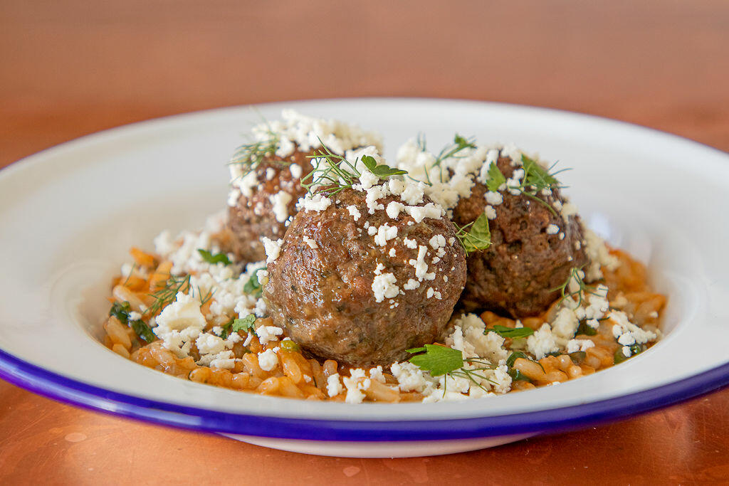 Black Sheep Foods' juicy, plant-based lamb meatballs are inspired by the highest-quality heritage breed lamb; the Greek-inspired dish is served with spinach rice and feta.