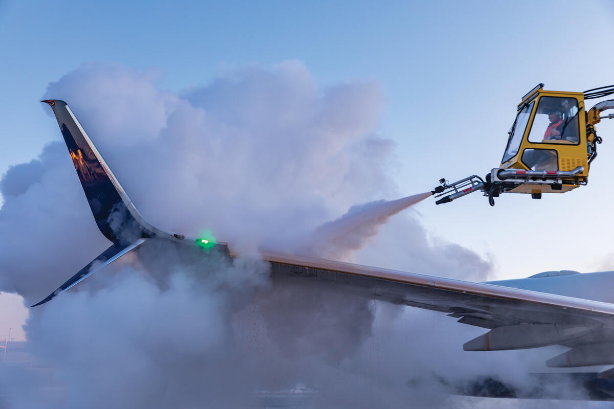 Deicing truck spraying down the wing of a Boeing 737-900ER