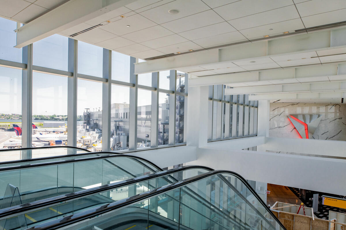 View looking down the escalator at Delta's terminal at LaGuardia Airport