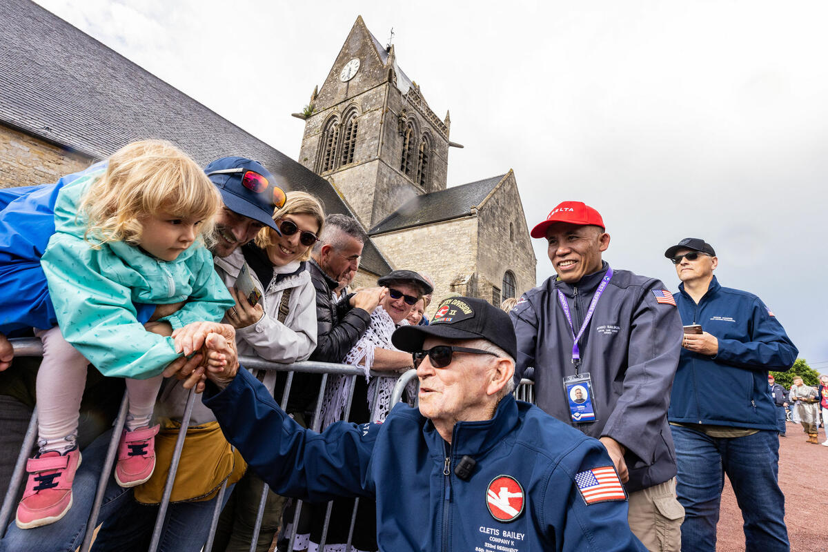 Delta’s Noni Balboa escorts Cletis Bailey through a parade in St. Mere Eglise.