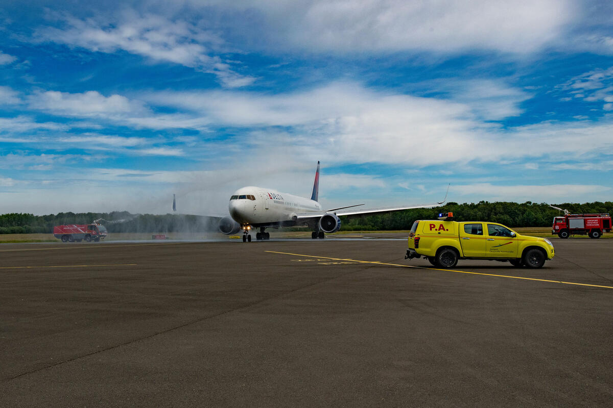 Delta makes its historic landing at DOL and is welcomed with a water cannon salute.