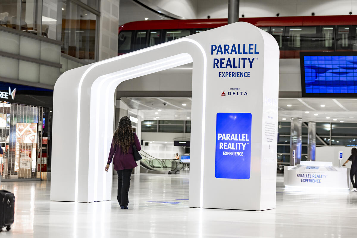 A female customer walking through the Parallel Reality Experience archway at an airport.