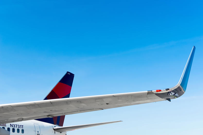 A view of a 737-800 wing and tail with a background of a clear sky.
