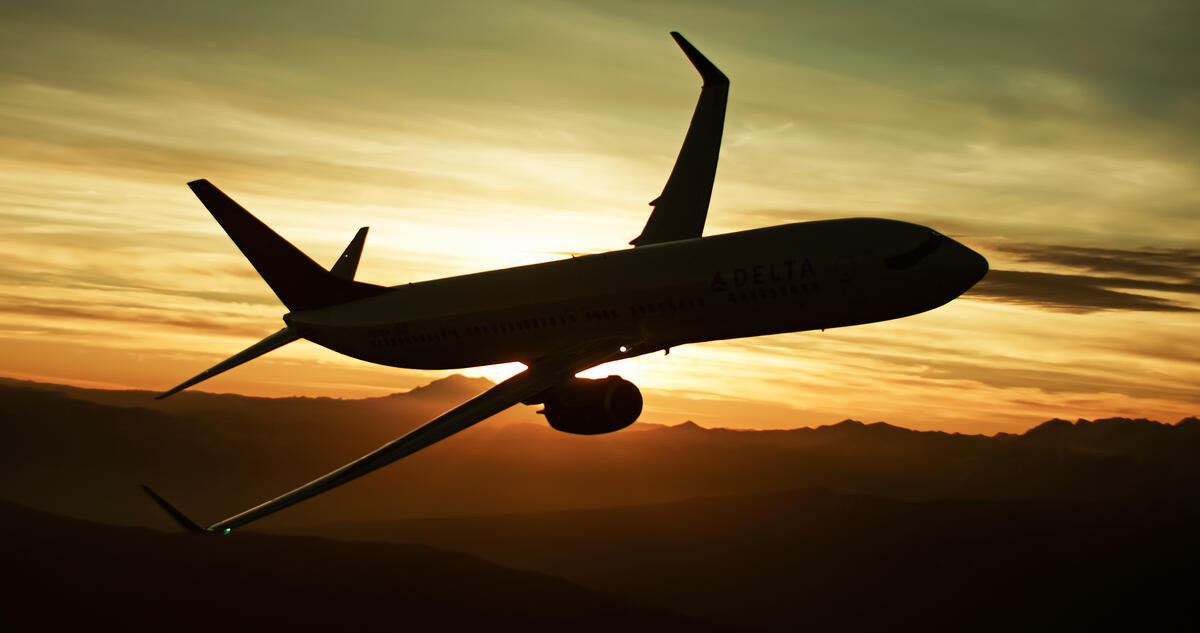 A 737-900 flies with a sunset in the background, creating a silhouette of the aircraft.