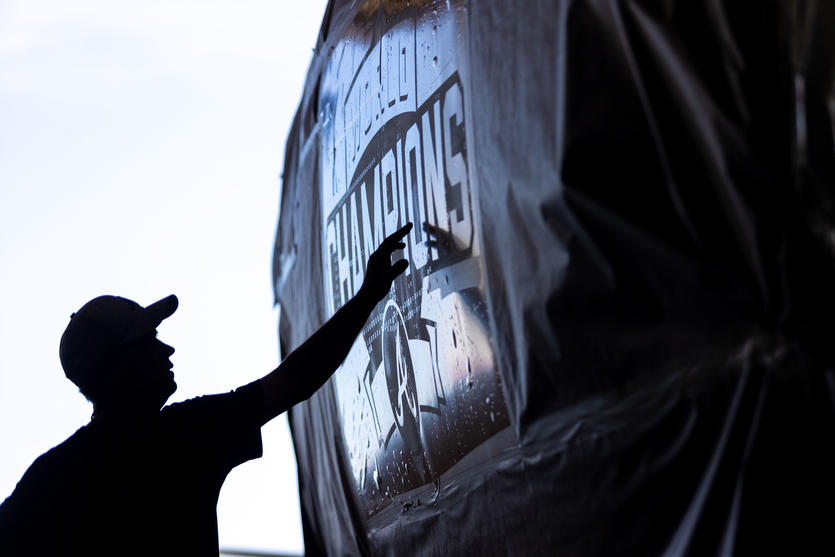 A Delta TechOps employee works on the "World Champions" plane dedicated to the Atlanta Braves.