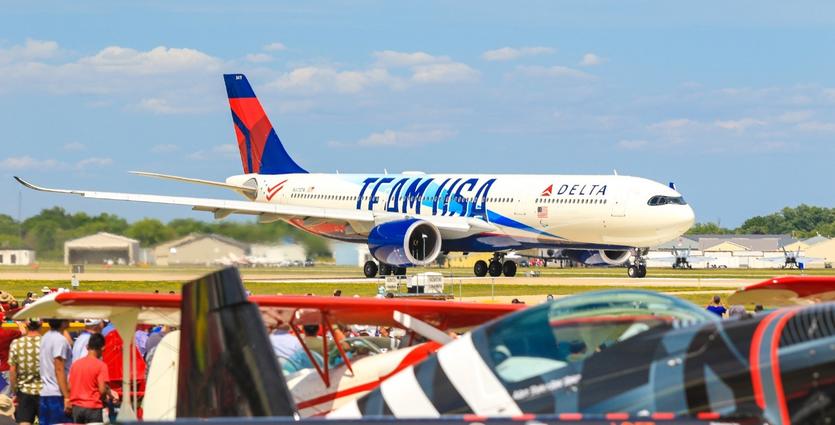 Delta’s Team USA A330-900neo taking off for its flight demonstration on July 26. (Delta)