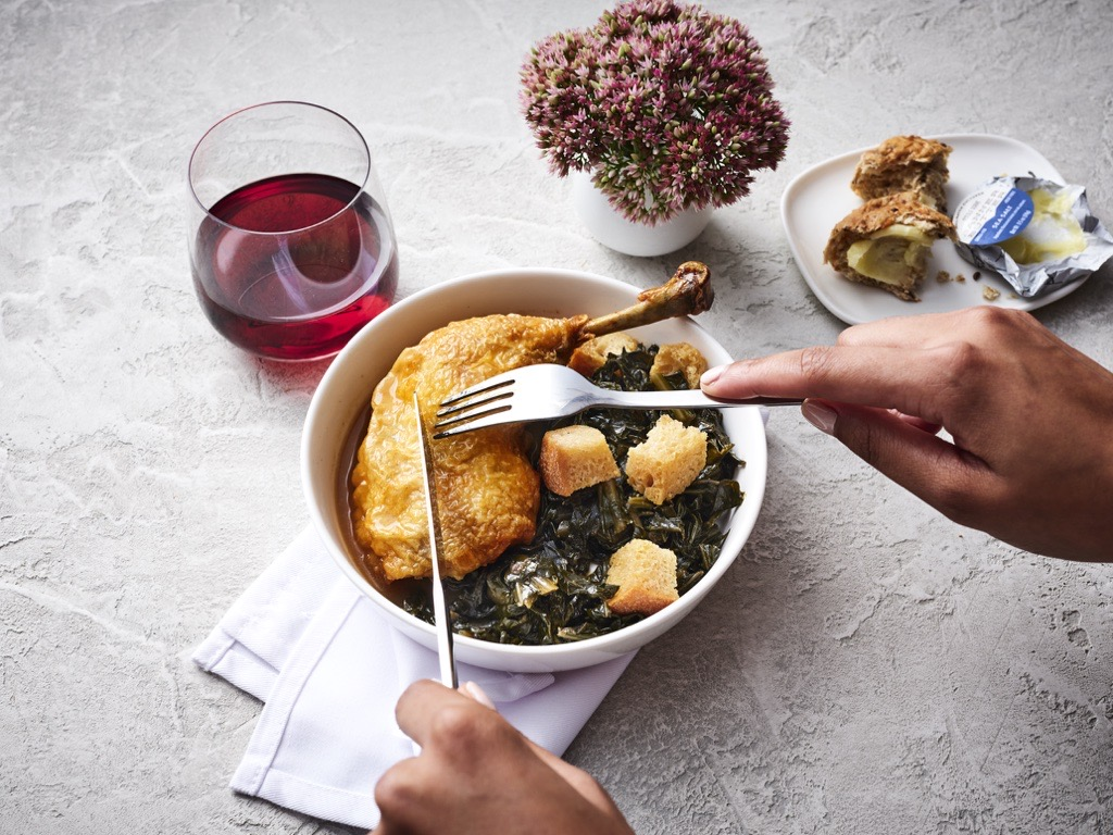Roasted chicken with smoked collard greens, a Delta first class meal offering, created by Chef Mashama Bailey