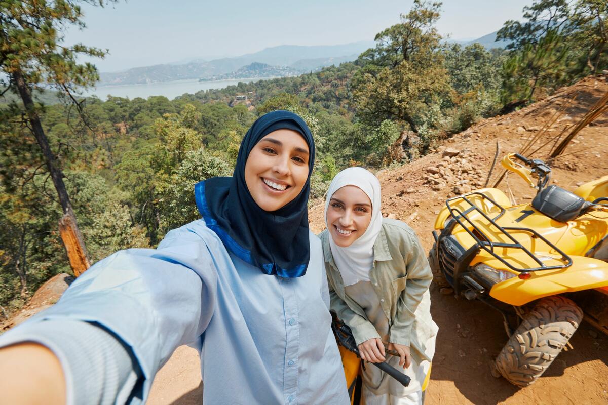 Two people pose for a selfie in front of an ATV in one of the images available as part of Delta's joint "Faces of Travel" campaign and database.