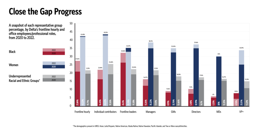 A chart outlines Delta's progress on its "Close the Gap" initiative.