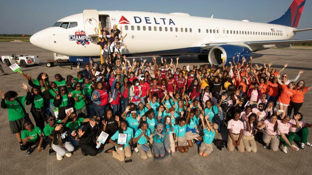 In honor of International Girls in Aviation Day, 130 girls ages 12-18 took flight on a Delta aircraft piloted, staffed and crewed entirely by women as they learned about careers in aviation and aerospace.