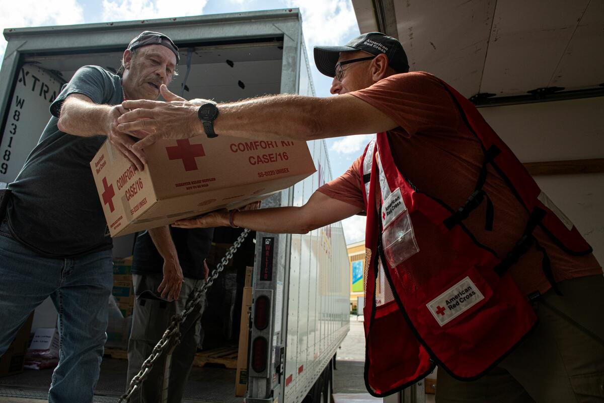 Red Cross Fulfillment Team volunteers working ahead of Hurricane Ian unload tractor trailers of supplies at the ESPN Center in Orlando, Florida. The goods will be heading to evacuation shelters all across Central Florida. The supplies include cots, blankets, gloves, flashlights and clean-up kits.