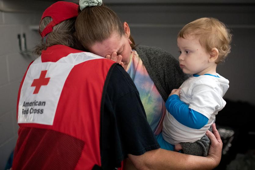 In this Oct. 1, 2022, photo taken in Arcadia, Florida, Red Cross volunteer Linda Rice comforts Christina Cochrane as she recalls the harrowing details of her family's ordeal the night that Hurricane Ian ravaged their home.