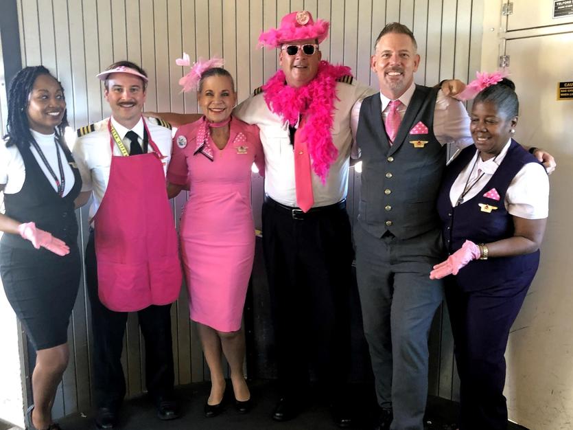 Flight attendant Anna Botha-Roberts, wearing her pink uniform honoring Breast Cancer Awareness Month, poses with several Delta colleagues.