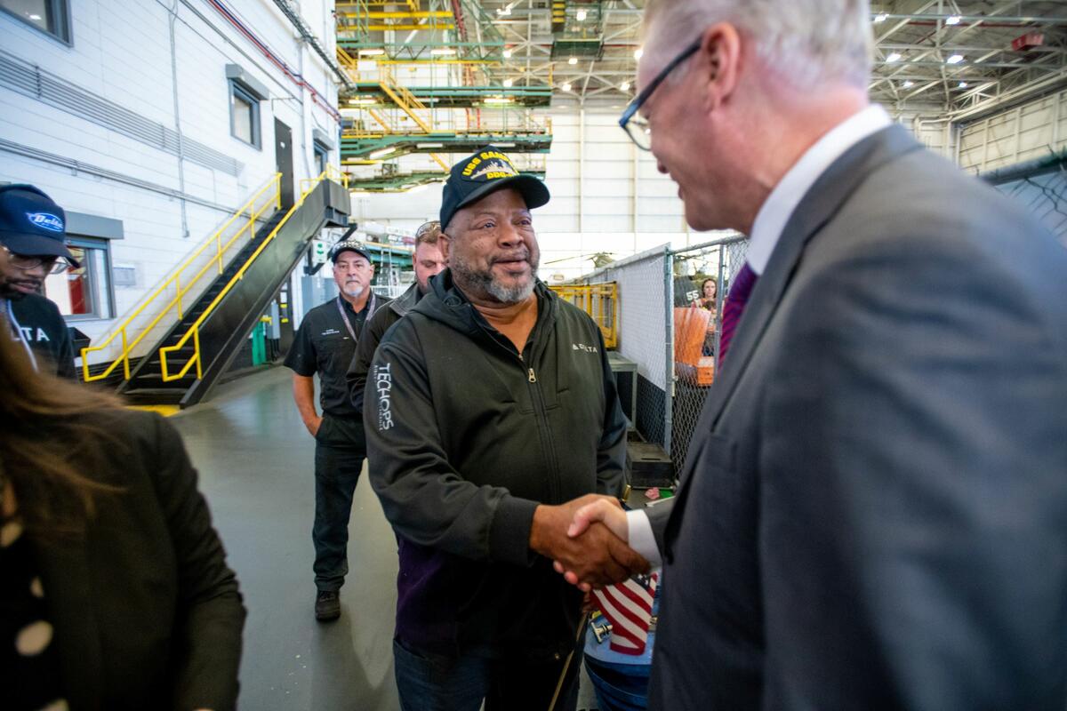 Delta CEO Ed Bastian shakes hands with one of the airline's TechOps employees at an annual Veterans Day celebration on Nov. 4, 2022.
