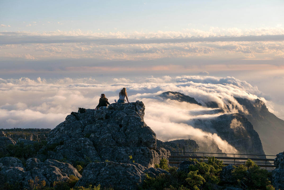 People on Table Mountain against cloudscape in Cape Town, South Africa.