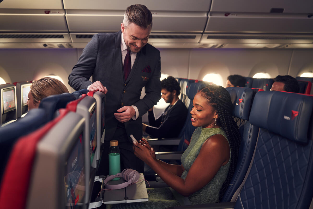 A Delta Flight Attendant assists a customer seated in Delta Comfort+ with their mobile device.