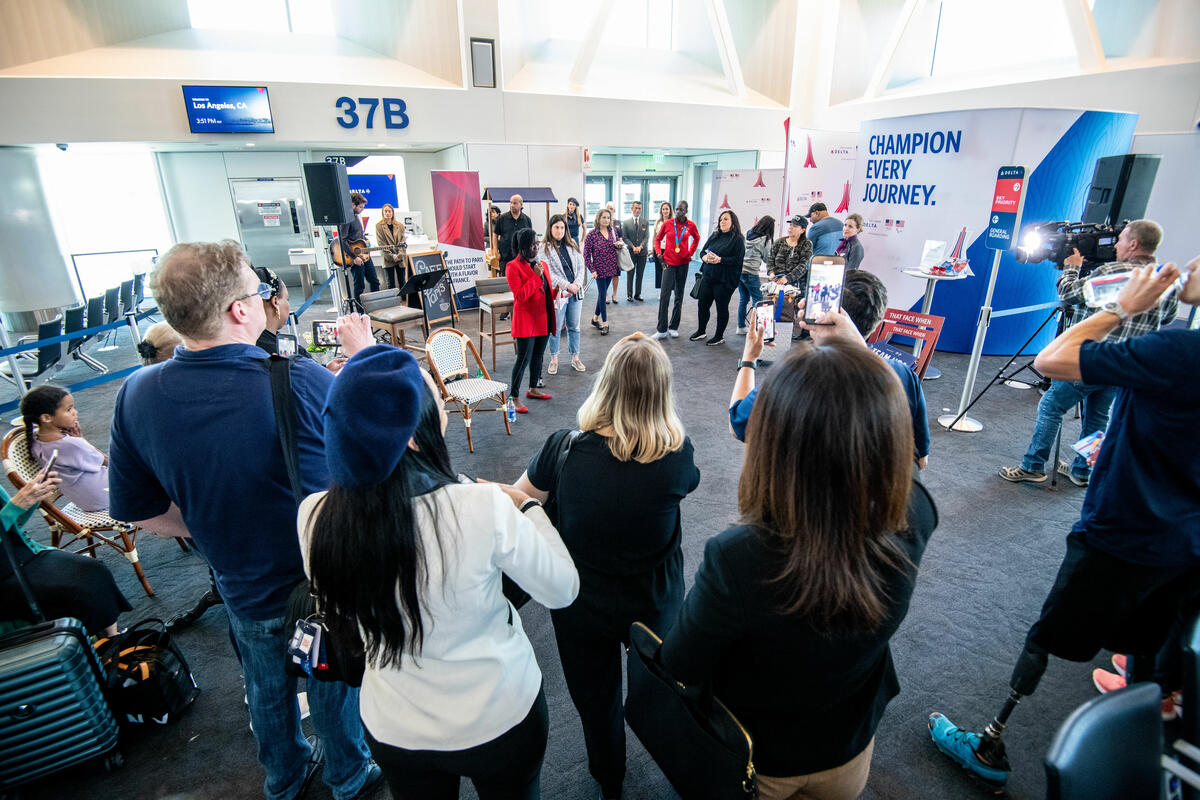 Delta people, customers and friends celebrate the departure of Delta Flight 290 from Los Angeles International Airport (LAX) to Paris Charles de Gaulle Airport (CDG).