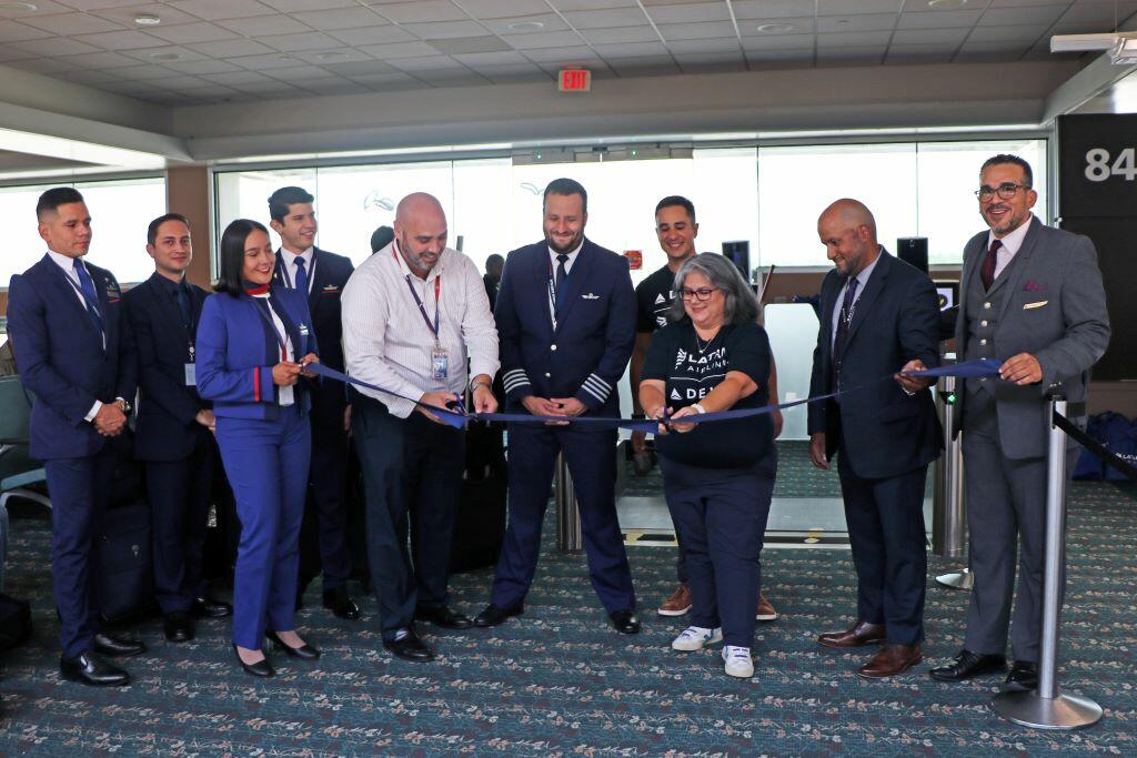 Delta and LATAM people cut a ribbon to signify the start of Bogota-Orlando service.