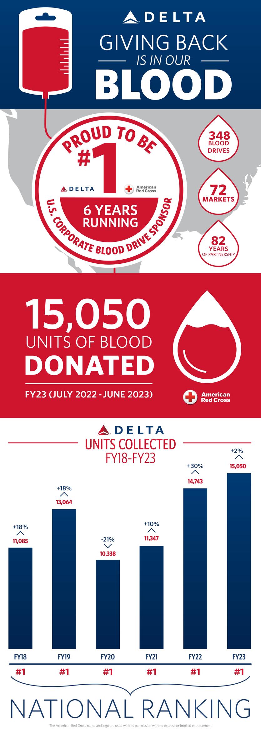 Delta people’s steadfast commitment to life-giving blood drives made the airline the No. 1 corporate blood drive sponsor of the American Red Cross for a sixth consecutive year, with employees, retirees and customers contributing a record 15,050 units of blood in fiscal year 2023 (FYE 6/30).