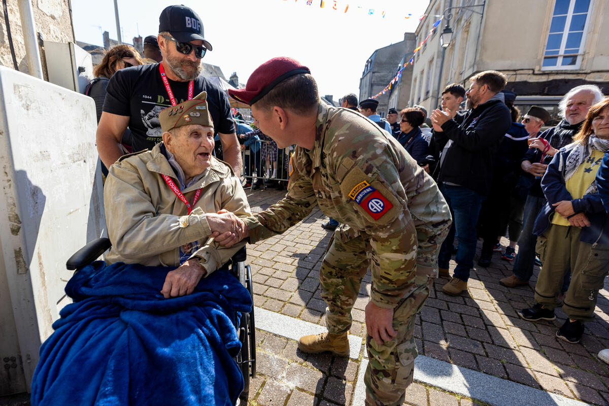 A World War II veteran is greeted by an Army Ranger in Normandy in June 2023.