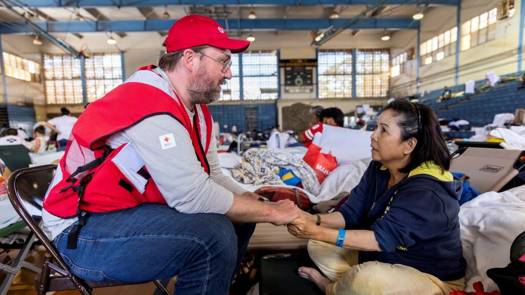 American Red Cross staffer Doyle Rader holds hands with Thao Tran as she recalls her harrowing and desperate story of survival from the wildfire that swept through Lahaina. She and her husband, Loc, climbed into the ocean to try and escape the smoke and flames as the fire bore down on them from their left and right.