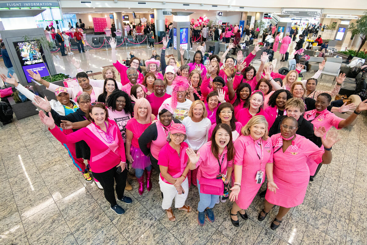A group of breast cancer survivors pose for a group photo before boarding Delta's Breast Cancer One charter flight.