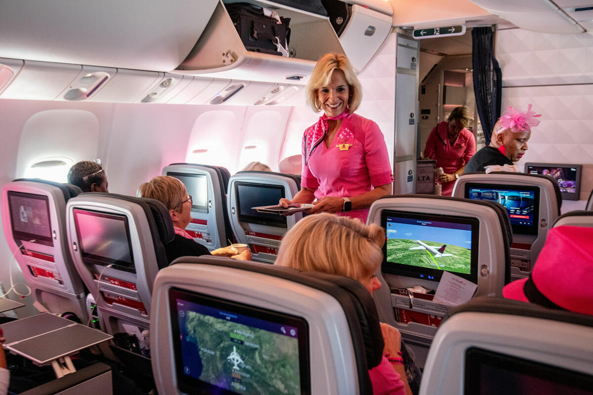 Delta leader Allison Ausband performs flight attendant duties on Delta's Breast Cancer One charter flight.