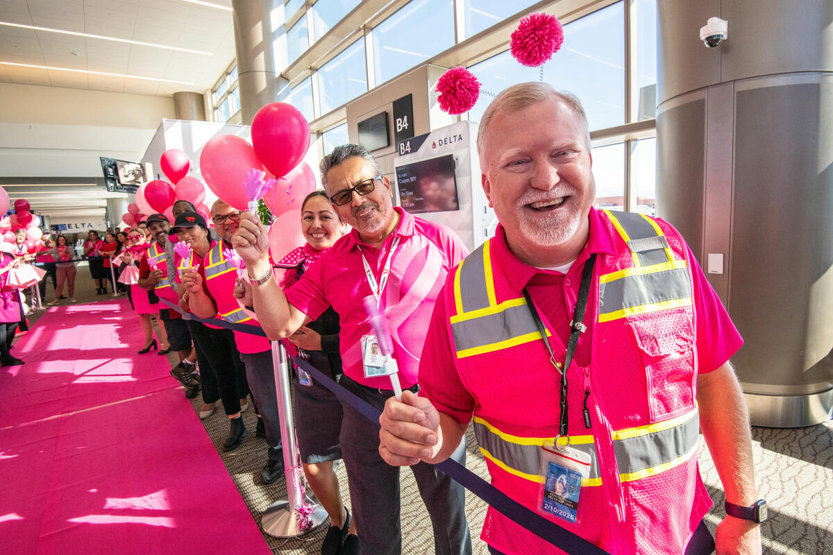 Delta people, dressed in all pink, cheer on the breast cancer survivors who flew on Delta's Breast Cancer One charter flight.