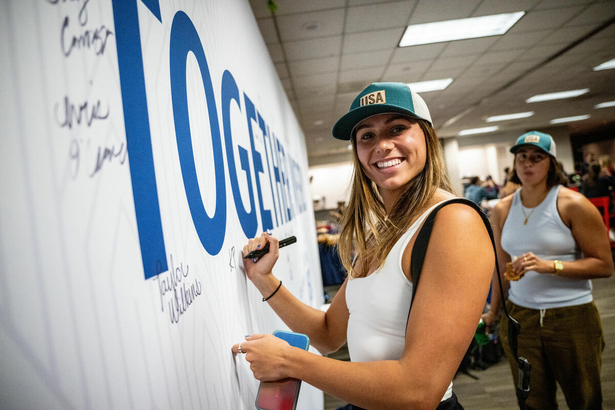 Team USA athletes sign the wall in Delta's customized athlete lounge in the ATL International Terminal.