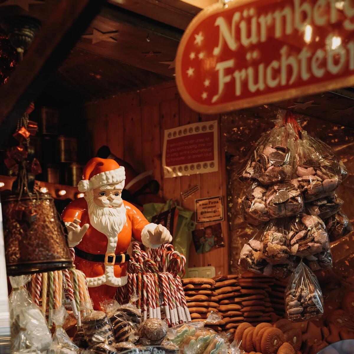 Holiday-themed trinkets on display in a Frankfurt Christmas market