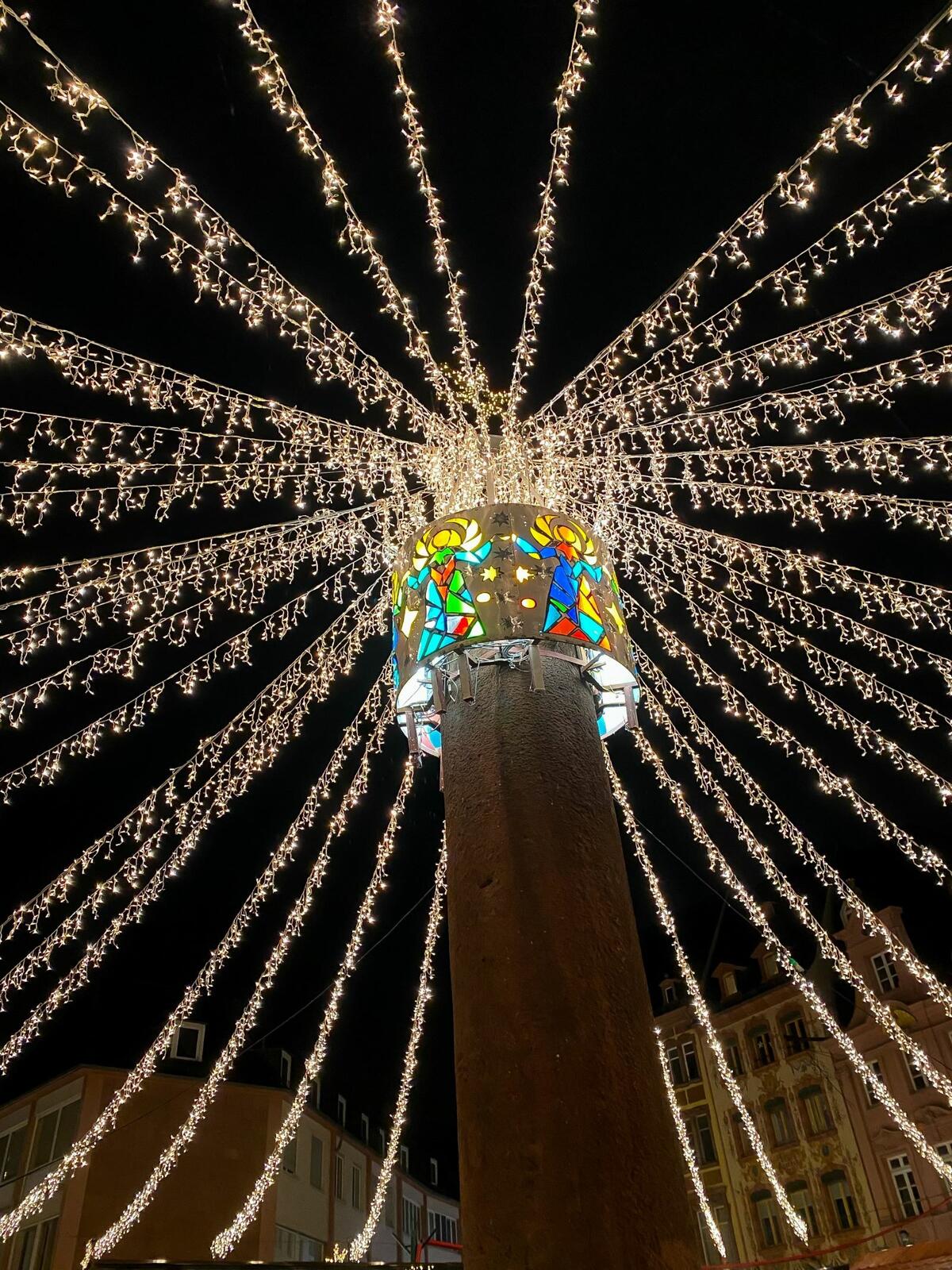 A string of jubilant Christmas lights illuminate the night sky in Frankfurt during the annual Christmas Market.