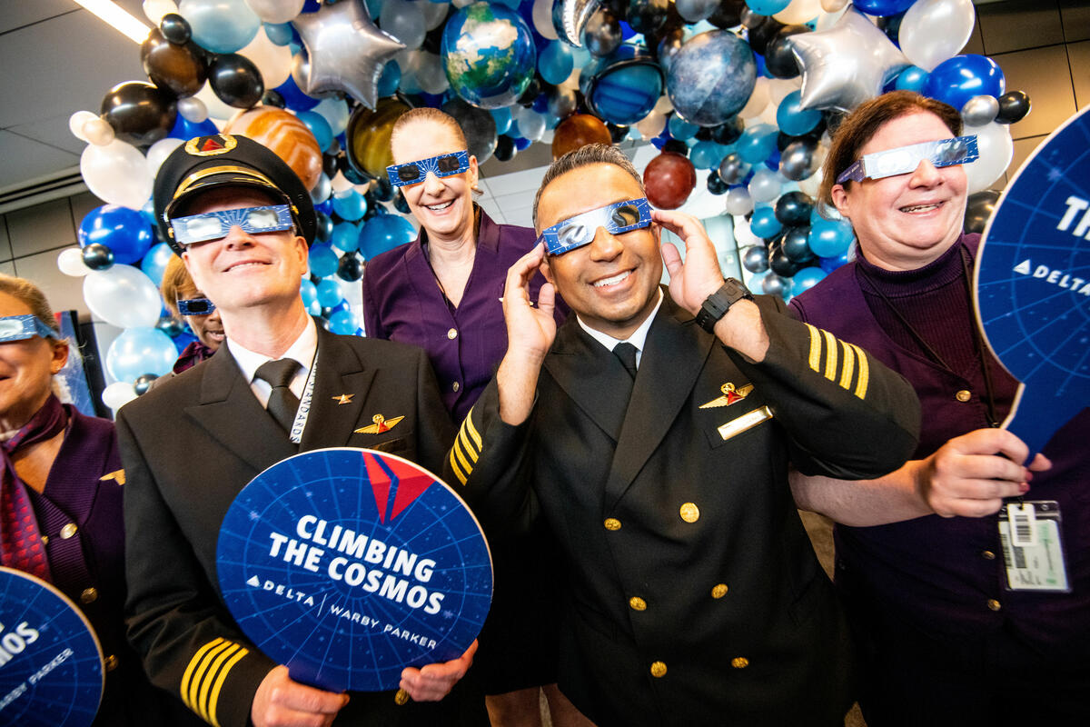 Delta pilots and flight attendants enjoy the festivities in Austin, Texas, ahead of one of Delta's two eclipse flights on April 8, 2024.