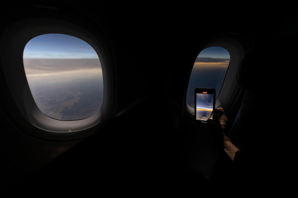 Customers on board DL 1010 from Dallas Fort Worth International Airport (DTW) to Detroit Wayne County Metropolitan Airport (DFW) view the solar eclipse.
