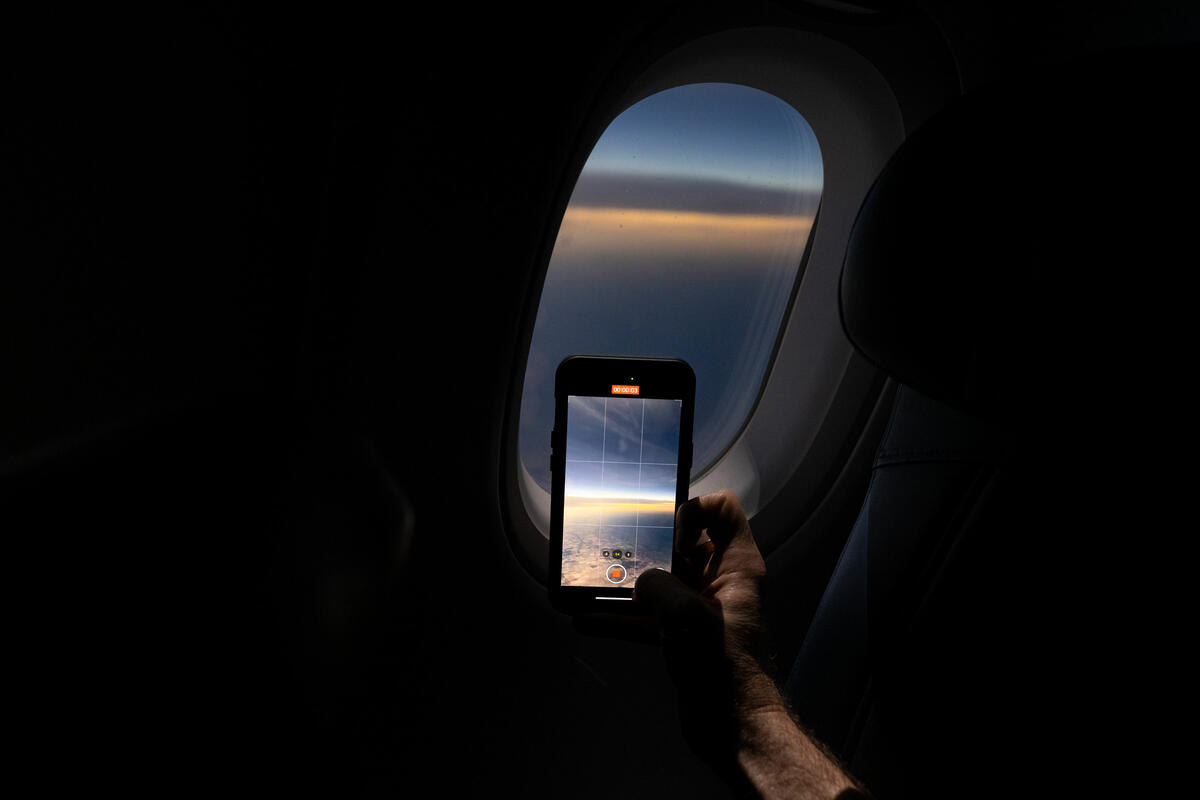 Customers on board DL 1010 from Dallas Fort Worth International Airport (DTW) to Detroit Wayne County Metropolitan Airport (DFW) view the solar eclipse.