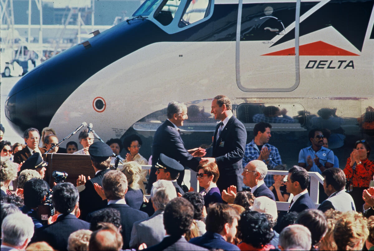 Former CEO Jerry Grinstein made his first impression on Delta when, as the CEO of Western Airlines, he led the merger of the two airlines in 1987 and was immediately appointed to Delta’s Board of Directors. With 44 cities added to the system, the merger made Delta the fourth-largest airline in the United States and the fifth-largest in the world at the time.