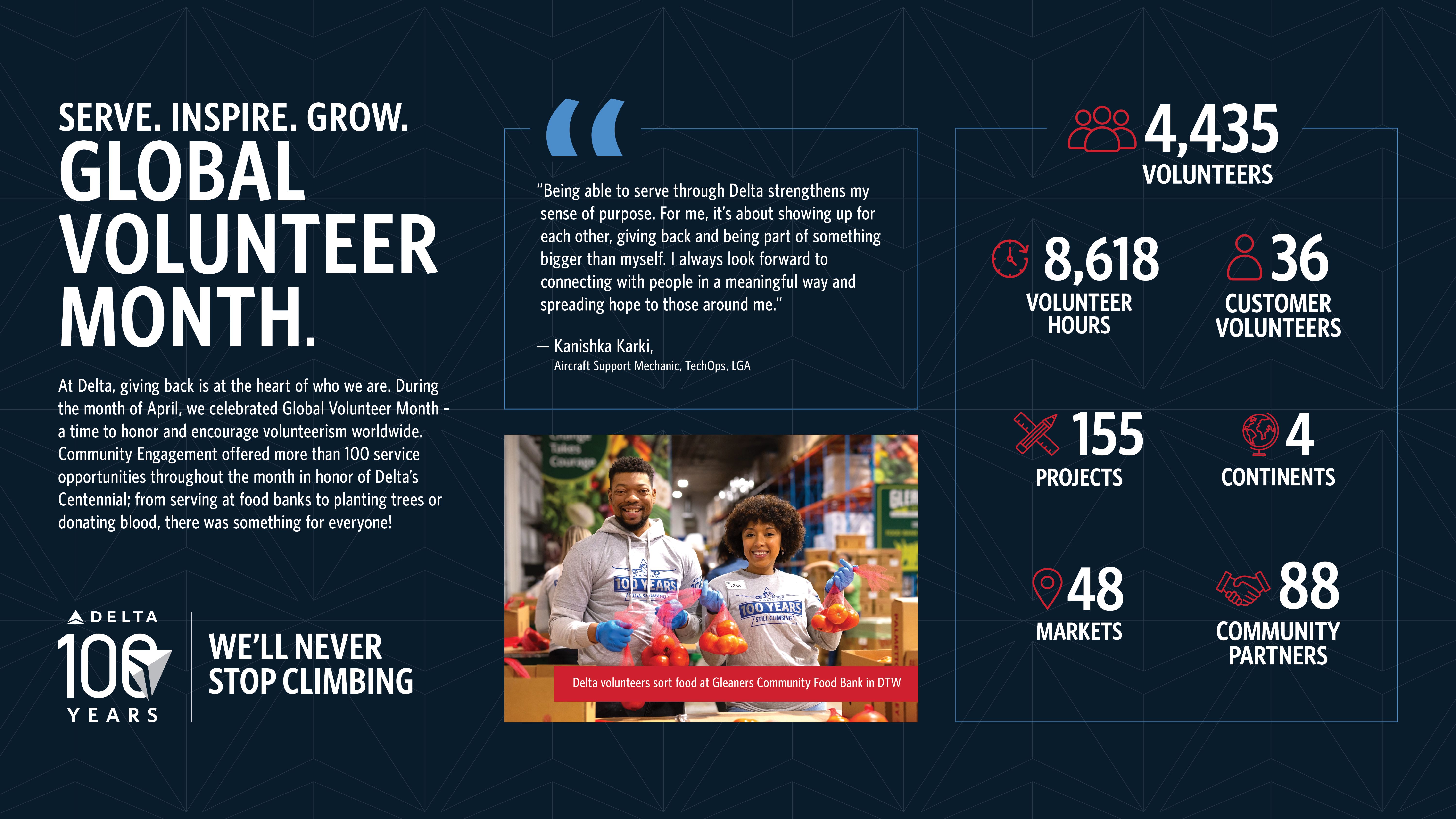 Throughout Global Volunteer Month, more than 4,400 Delta volunteers completed 155 community events and over 8,600 hours of service around the world. Across 48 markets, 8 countries (Greece, Mexico, Chile, Brazil, Japan, India, the U.S. and the UK) 4 continents, 40 U.S. cities and 23 states – whether 5 or 150 volunteers were needed – Delta people showed up to give back.