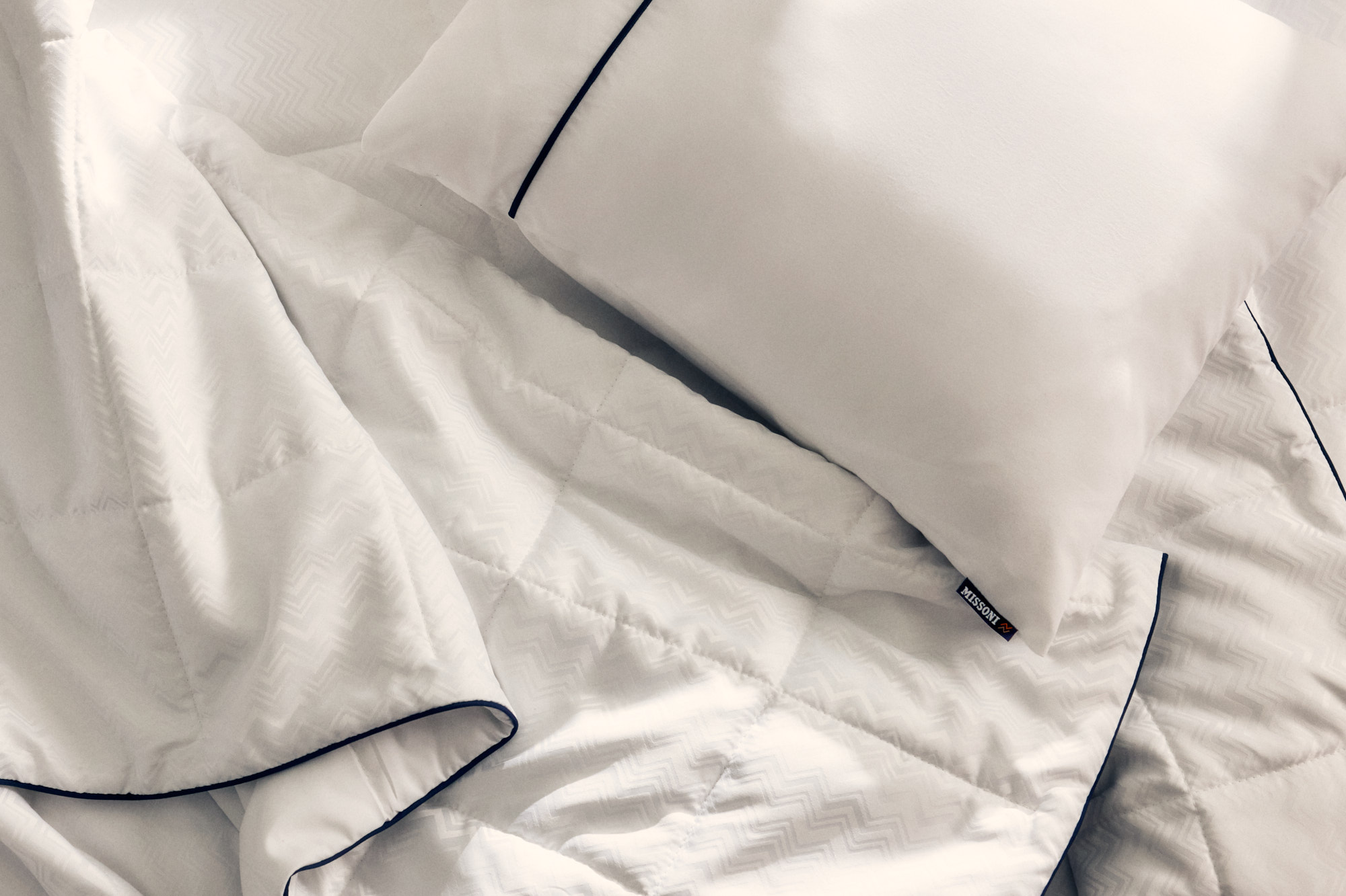 El nuevo juego de cama de Delta One incluye el edredón Missoni y una almohada blanca para dormir, con un sutil y elegante diseño en zigzag de Missoni y detalles en azul marino.