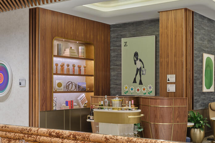贵宾室主色调的灵感源于洛杉矶的自然风光和人文景观,使人联想到南加州之美。日落色调与皮革和胡桃木装饰相得益彰,为Icon Bar更添光彩。由祖母绿石英岩和缟玛瑙装饰的吧台后墙,尽显海岸的轻盈开阔之韵味。