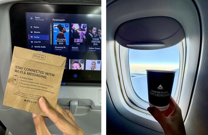 As part of efforts to reduce single-use-plastic in flight, Delta has made progress on two big milestones. Last year, Delta announced it was testing a new paper cup on board, which will help eliminate the nearly 7 million pounds of single-use-plastic on board annually once fully implemented. Last month, the paper cups rolled out on all international flights and can be expected on all domestic flights in the first half of 2025. Additionally, Delta has transitioned to new kraft paper ear bud wrapping, a shift from the traditional plastic packaging on the more than 60 million units handed out each year.